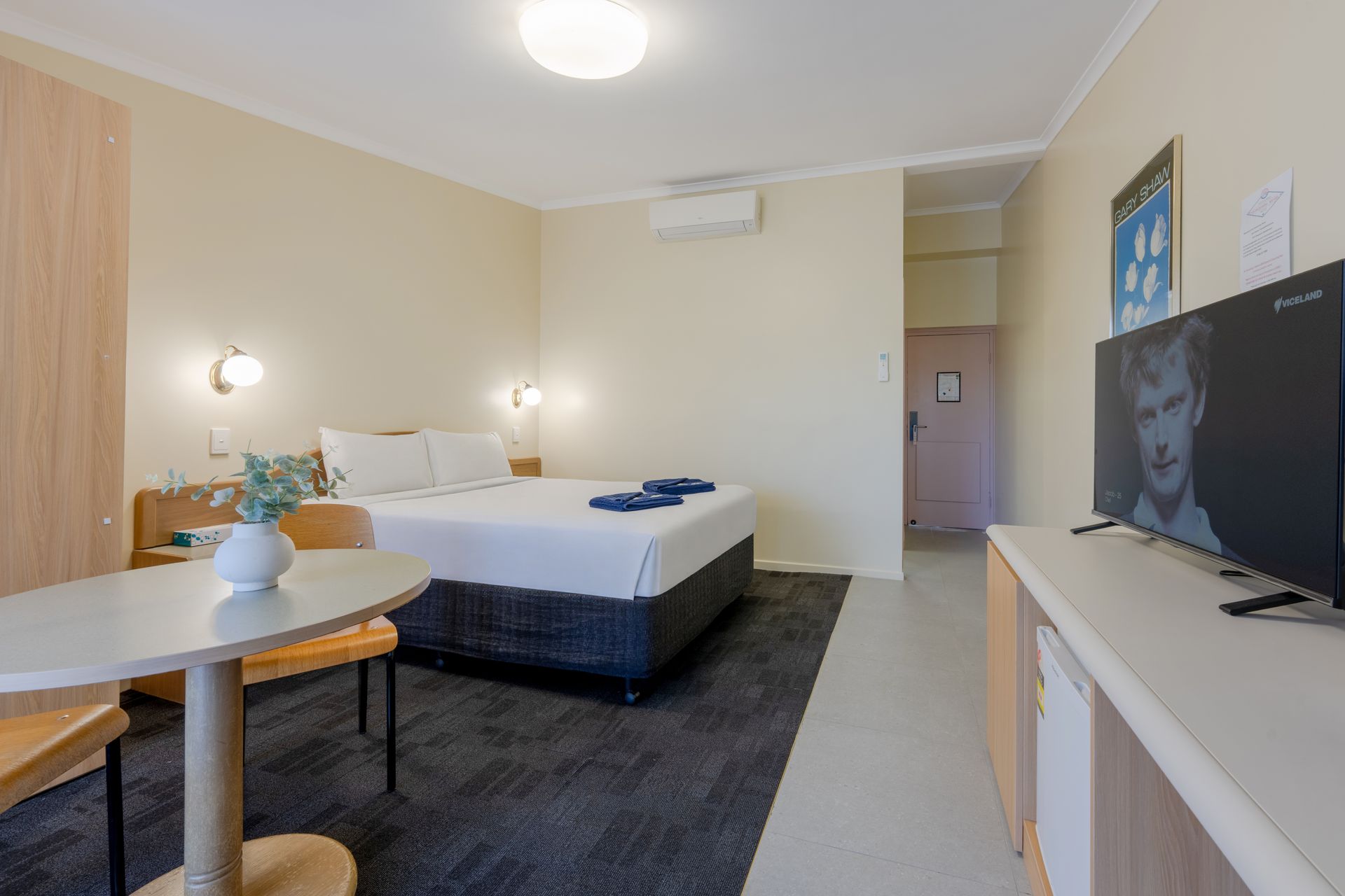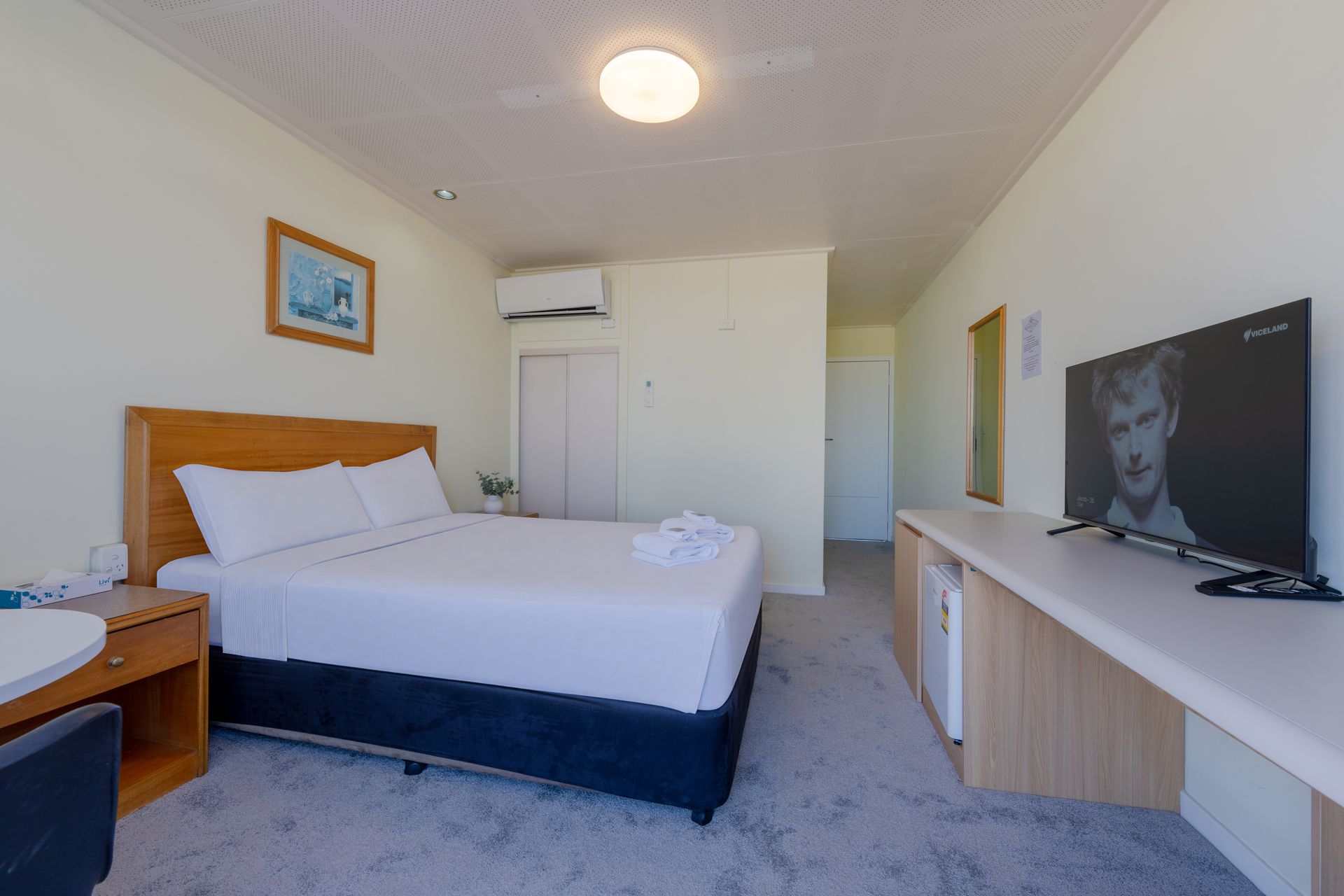 Comfortable non-smoking room with one queen bed, ensuite bathroom, smart TV, free WiFi, kettle, microwave, mini fridge, hairdryer, and iron – ideal for a convenient and affordable stay.